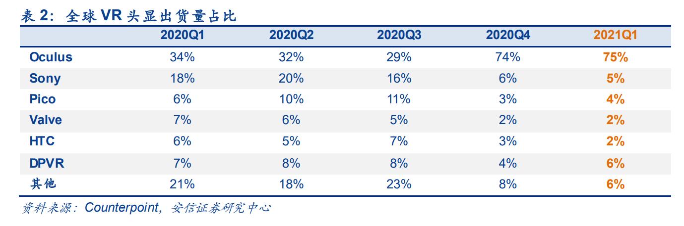 VR 奇點已現:消費級硬件銷量持續強勁,即將跨過 1000 萬臺臨界點。Facebook 的創始人扎克伯格認為,在一個平臺上需要有約 1000 萬人使用及購買 VR 內容才能使開發人員持續研發以及獲利,而一旦超過這個門檻,內容與生態系統將會實現跨越式發展。這一臨界點,VR有望于2021年達到。據IDC統計,2021年第一季度VR頭顯全球出貨量同比增長52.4%。其中,Oculus 憑一己之力推動全球整體 VR 市場的增長,2021 年第一季度其產品占據全球VR 出貨量的近三分之二,Oculus Quest 2 自 2020 年第四季度發布以來在消費者市場表現搶眼。除 Oculus 外,中國 VR 本土廠商 DPVR、Pico 在 2021 年第一季度也表現不俗,DPVR 位居第二,出貨量同比增長 108.6%;Pico 位居第三,出貨量同比增長 44.7%。DPVR、Pico 立足中國穩固的本土市場的同時致力于通過教育等商用領域布局開拓國際市場。此外,2021 年第一季度,HTC、Sony 在 VR 全球出貨量中分列廠商第四、五位。HTC、SONY 份額下降較快主要系當前兩公司的在售產品款式較老,新款產品發售后即將成為 Oculus 的有力競爭者,市場份額排名有望上升。