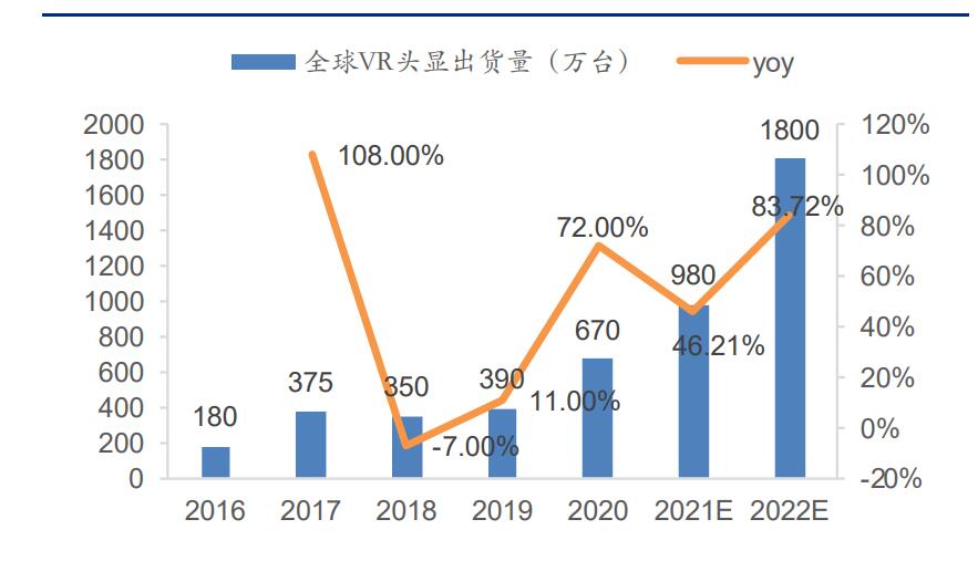 VR/AR 出貨量增長顯著,已進入產業化放量增長階段。比之 2018-2020 年相對平緩的終端出貨量,隨著 Facebook Quest2、微軟 Hololens2 等標桿 VR/AR 終端迭代發售、電信運營商虛擬現實終端的發展推廣,以及平均售價從當前 2500/9700 元進一步下降,2021-2022年 VR/AR 終端規模上量、顯著增長。陀螺研究院報告顯示,2020 年 VR 頭顯全球出貨量達670 萬臺(yoy+72.0%),AR 眼鏡全球出貨量達 40 萬臺(yoy+33.3%); VR/AR 全球出貨量將持續高速增長,預計到 2022 年 VR/AR 全球出貨量將分別達 1800/140 萬臺。
