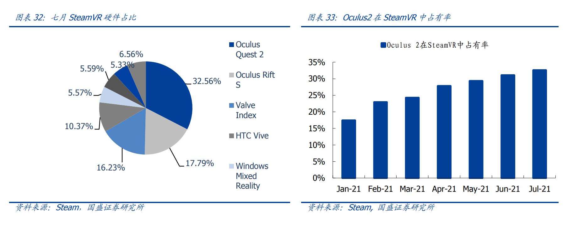 7 月 Oculus Quest 2 市占率持續增長,再創新高。2021 年 7 月根據 SteamVR 的最新數據顯示,SteamVR 活躍玩家占總玩家數的 2.07%,較 6 月的人數有一定的上升。一方面由于 Oculus Quest 2 銷量的持續增長,另一方面,隨著 Steam 平臺夏季促銷和新游戲等優秀應用端的出現,VR/AR 所面向的客戶群體不斷增加也是必然趨勢。